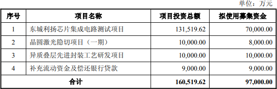 利扬芯片首次公开发行股票募集资金总额为53,605.20万元;扣除发行费用(不含增值税)后,募集资金净额为47,094.26万元。利扬芯片于2020年11月5日披露的招股说明书显示,该公司拟募集资金47,094.26万元,分别用于芯片测试产能建设项目、研发中心建设项目、补充流动资金项目。