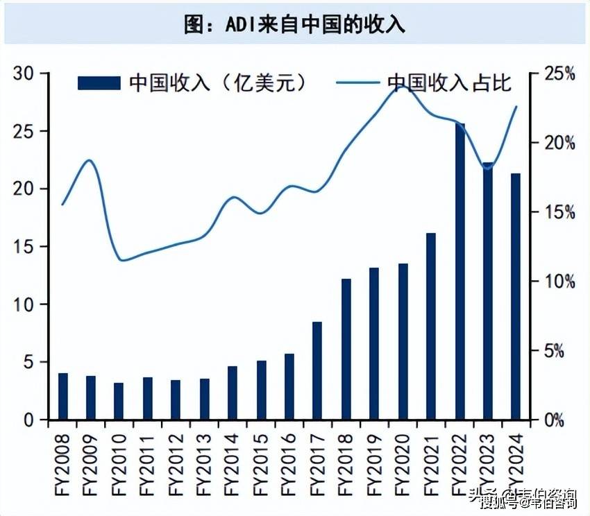 ADIFY2024年来自中国的收入约21亿美元,同比减少5%,收入占比23%(按采购公司产品的分销商或OEM厂商所在地统计)。