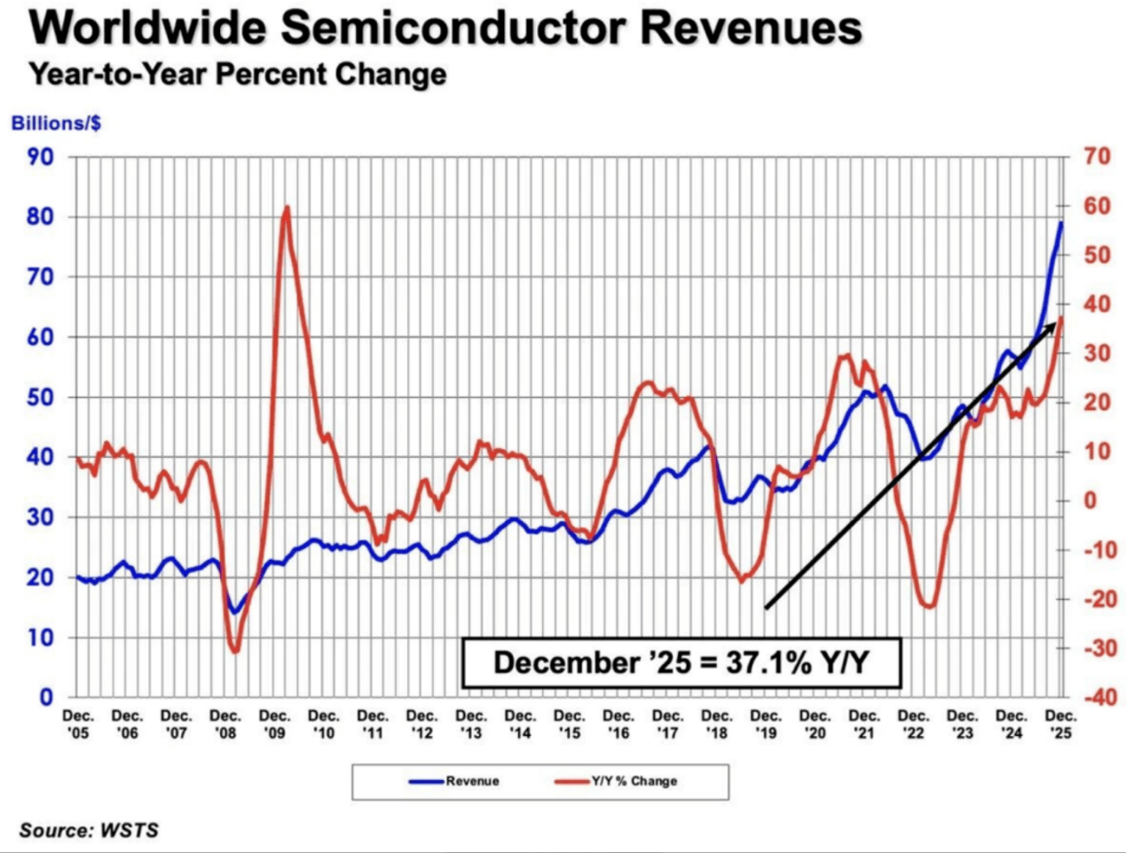 半导体行业协会(SIA)数据显示,2025年行业总销售为7917亿美元,预计2026年还将增长26%。SIA首席执行官表示,市场达到1万亿美元里程碑的速度远快于最初预期。