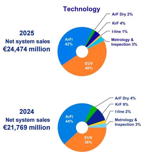 其中,ASML的EUV(极紫外光刻)系统销售额在2025年达到 116 亿欧元,同比增长39%,EUV在系统收入中的占比从2024年的38%上升至48%,成为公司系统收入中占比最高的单一技术类别。截至2025年末,公司未交付的388亿欧元订单中有255亿欧元为 EUV 订单。2025年第四季度,ASML还确认了两套 High-NA EUV系统收入。